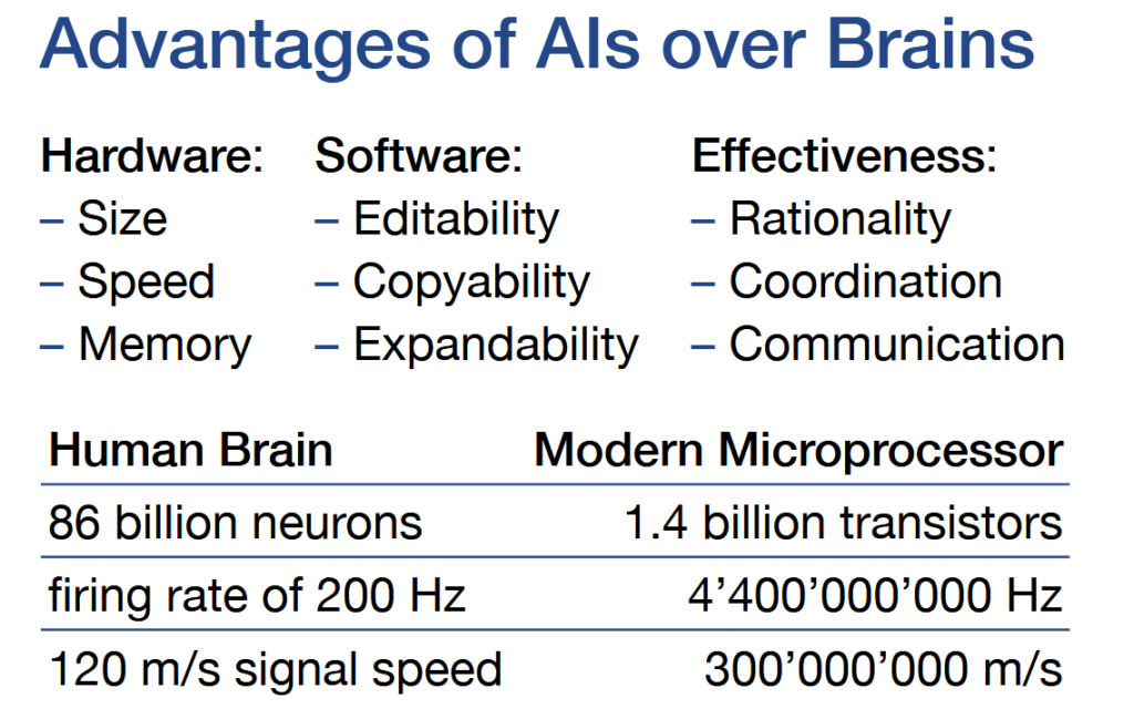 Det å stille opp gigahertz mot hertz, antall transistorer mot antall nevroner og båndbredde mot «kognitiv kapasitet» er en feilforestilt sammenligning. Flere kretser og mer strøm gir riktignok større kvantitativ rekkevidde, men skaper ikke forståelse. Slike overfladiske mål uten dypere substansiell forankring leder raskt til fanatiske utspill og forestillinger av typen Bostrøm og hans likesinnede, log.-longterm’ister. Den mekaniske klokken utgjør fortsatt det kategoriske skillet mellom hjerne og maskin, og en klokkestyrt konstruksjon blir ikke til en hjerne uansett hvor mange dimensjonerte lag man presser inn som «funksjon». Det samme gjelder symbolmanipulasjon, altså språkmodeller (LLMs) og lignende systemer som bare simulerer menneskelig meningsappell uten årsaksforståelse.