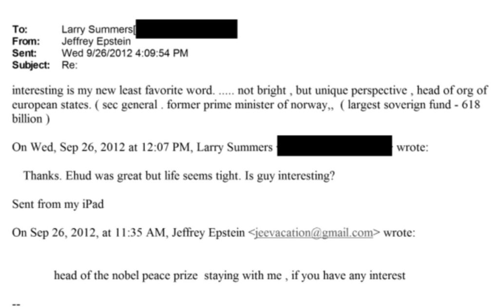 Jeffrey Epstein skriver i en av sine eposter til Larry Summers (professor i økonomi og tidligere amerikanske finansminister) at Jagland Jeffrey Epstein played up ties to head of Nobel Peace Prize committee | AP News ikke er smart (not bright), men han har et enestående perspektiv, en vurdering som ser ut til også å hatt en betydning da Arbeiderpartiet ikke holdt ut med ham som leder i mer enn ni år.
