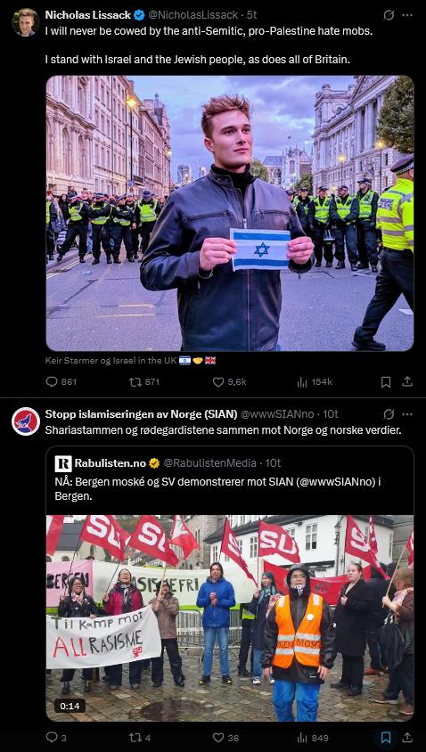 Legg bare merke til hvordan «Islam vs. Israel» totalt dominerer og griser til det politiske diskursrommet mellom «Høyre» og «venstresiden» i «vesten» på den ene her, og det rett etter hverandre.