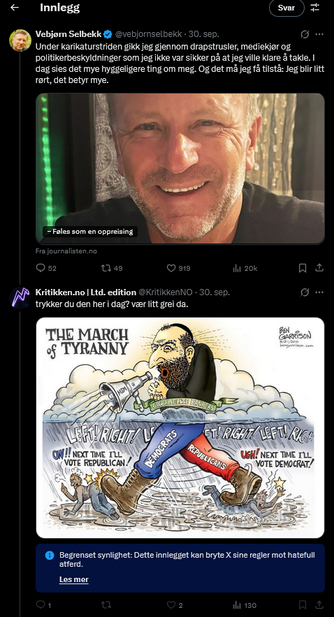 Masserapporteringen og community notes er begge en vits, og personlig har jeg blitt limited visibility’d og dermed begravd i bullshit på diverse feeds, noe som tyder på mye rart. Dette eksplititt på Kritikken-kontoen etter at jeg der omtalte Mr. Musk og «MAGA» på en mindre positiv måte. Ikke noe stort tap, da det er bare idioter på xTwitter uansett, kanskje med unntak av mine få følgere der. Jeg tror dessuten sensuren nå blir verre enn hva den har vært. Innholdet generlt er definitivt degenerativt med tanke på noen som helst politisk fremgang. Bare et show og ekkokammer for retarderte, dessverre.